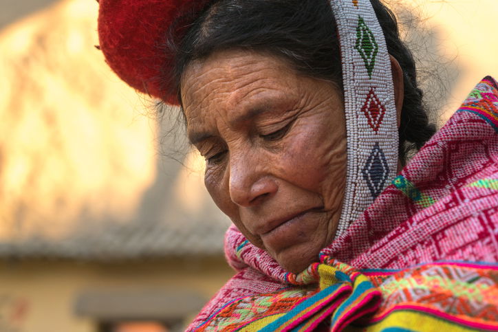 Peruvian Woman looking down as she weaves in Ollantaytambo, Peru